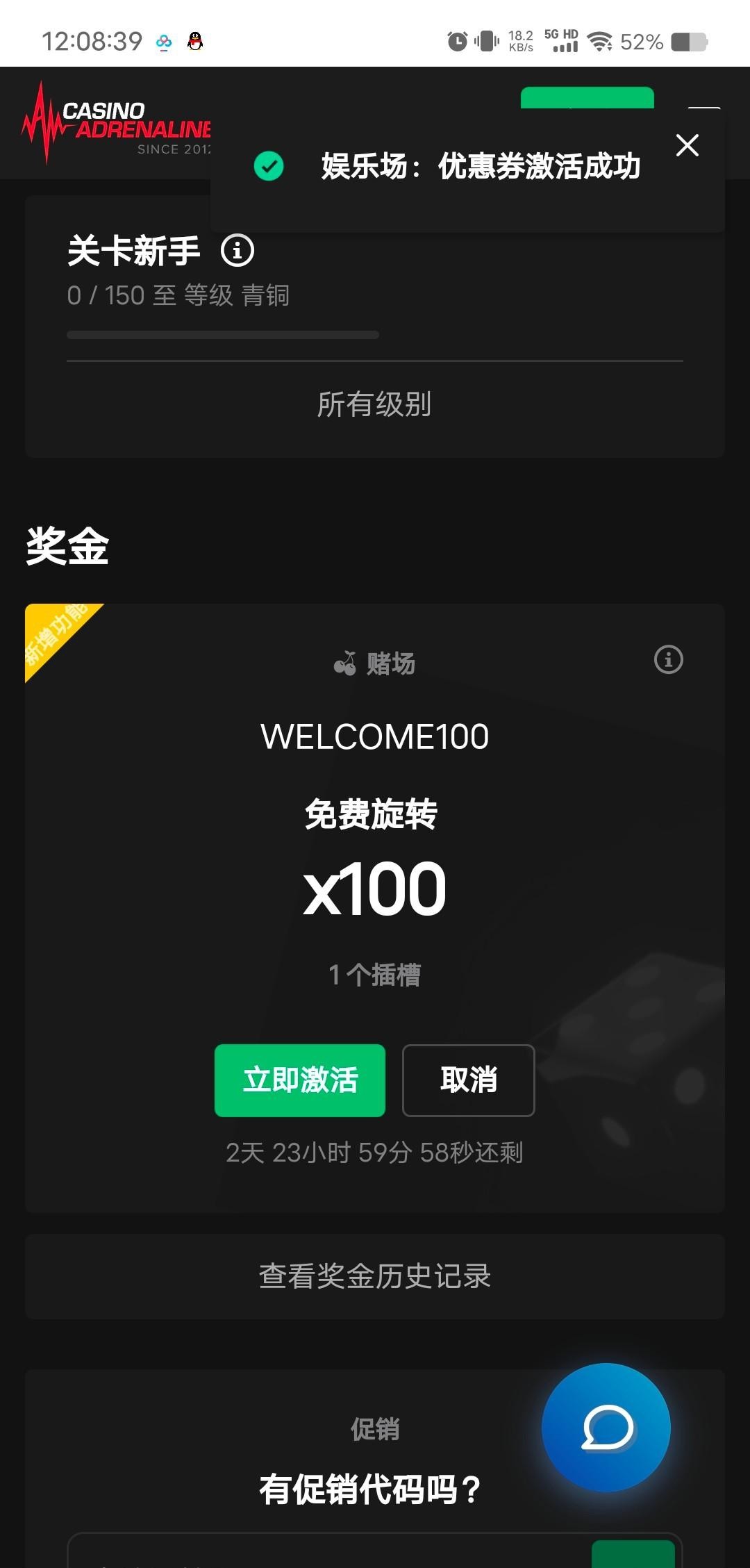 邮箱注册,选择美元,注册后会发邮件,要去邮箱验证,促销里输入兑换码WELCOME100,免费旋转转完需要打40倍流水,提现自测。看不懂的去翻译中文。网址https://www.casinoadrenaline.com/profile/promo/casino