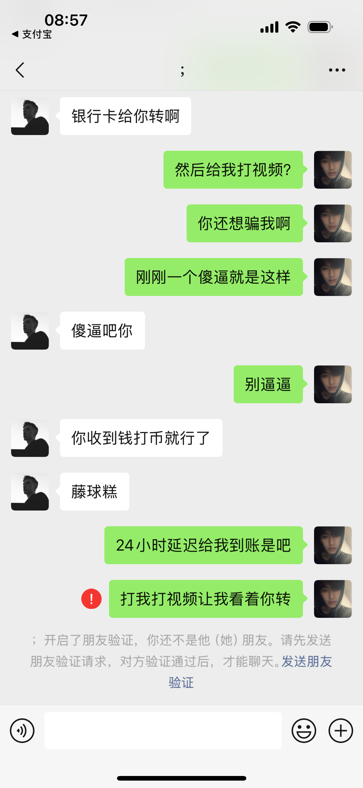 今天卖币给我扫0.01备注封控让我加他好友然后给我转账 再说转不了换支付宝也一样 骗我说是不是收钱太多了让我用银行卡 然后跟我打视频电话对着他的手机银行输入了我的名字卡号让我对一下 然后让我同时给他打币 都输入最后一个密码同时转给对方 后面我发觉不对劲就没有 我一直在等银行卡到账短信 一直没有 我就没给他转 他就跳脚了